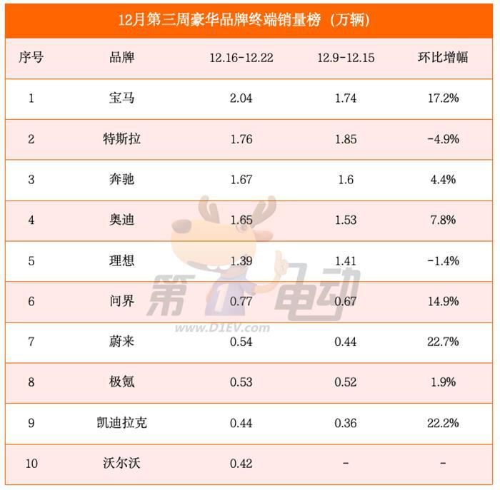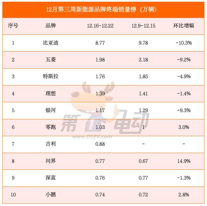 今日,12月第三周(12.16-12.22)新能源品牌终端销量出炉。