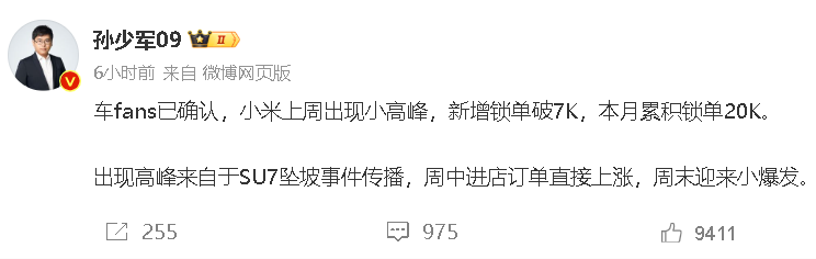 坠崖事件的余波还在持续。终端大V孙少军表示,小米汽车上周订单量出现小高峰,新增锁单破7000台,本月累积锁单20台。