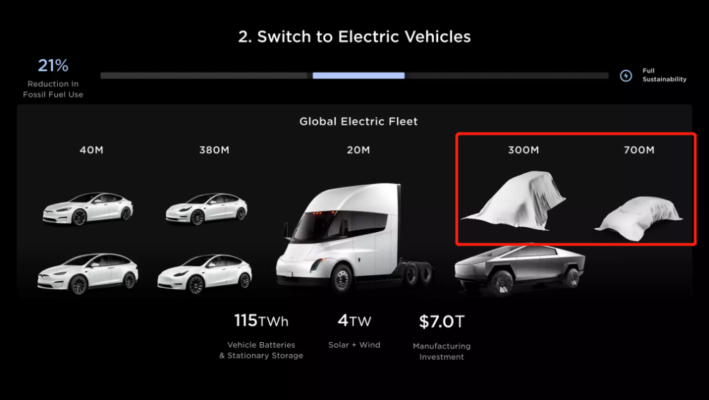 在特斯拉秘密宏图第三篇章(Master Plan 3)10万亿美元投资计划中,特斯拉展示了两款针对大众市场的汽车——一款商用货车和一款较小的汽车,这将大幅扩大其销量。