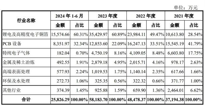 招股说明书显示,力源海纳主营业务为工业电源产品的研发、生产与销售,主要产品包括高频开关电源、高速脉冲电源和其他电源。公司产品主要应用于锂电及高精度电子铜箔、PCB设备、特纯电子气体等行业。