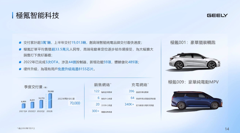 上半年,极氪完成交付19,013辆,按照吉利的说法,极氪创下了高端智能纯电品牌交付最快速度。而截至2022年7月底,极氪累计交付量已达到30,039辆。