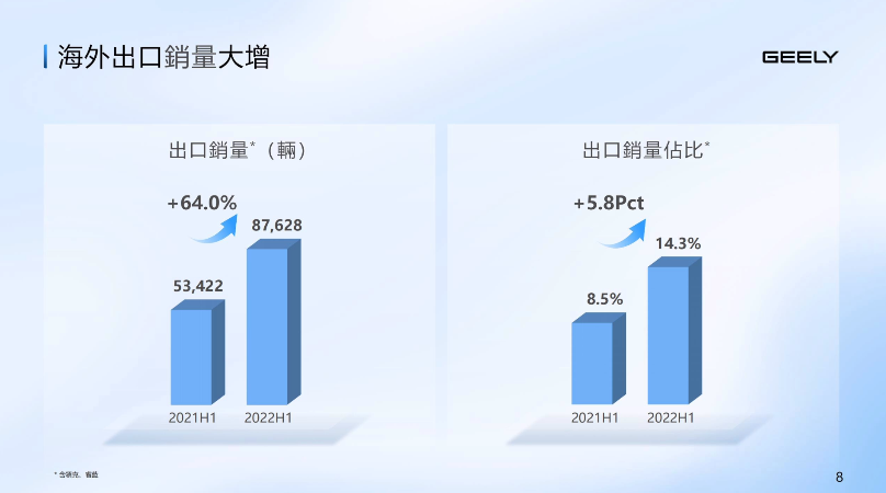 今年上半年,吉利汽车海外出口创新高,出口销量达到8.8万辆,同比增长64%,位居行业第四(较去年全年提升一位)。