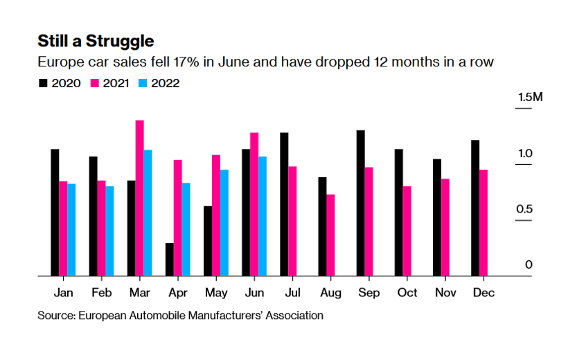 7月15日,欧洲汽车制造商协会(ACEA)公布的数据显示,今年6月,欧洲新车销量约为107万辆,同比下降17%。由于持续的供应链混乱和创纪录的通胀困扰着欧洲汽车行业,欧洲新车注册量创下了自1996年以来同期最低水平。另外值得注意的是,欧洲新车销量已连续12个月下跌。
