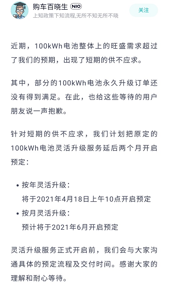 也正因如此,灵活升级方案一经发布,就迅速引发了用户的讨论,而从最终结果来看,蔚来还是远远低估了实际终端的需求。因为,就在一天以前,蔚来官方App发布消息称,由于100kWh电池组出现了短期的供不应求,所以原定的“100kWh电池灵活升级服务”将延后两个月开启预定。