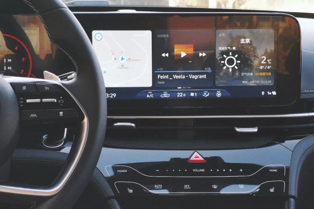 如今家庭购车用户的年龄段多为85、90后,作为有着强烈互联网属性的人群,智能科技已上升为他们选车时最关注的因素。北京现代近两年的新产品都在智能化方面用力颇多,全新一代名图同样也体现了这一思路,双12.3英寸的仪表盘和中控双连屏和第十代索纳塔尺寸相同,全液晶仪表UI界面非常美观,功能很齐全,并且可以根据驾驶模式不同更换颜色。另外仪表盘还提供了一个非常实用的功能,在用户打转向灯时,仪表盘会显示相应一侧的摄像头影像,这一功能对并线时手忙脚乱的新手司机简直不能再友好。